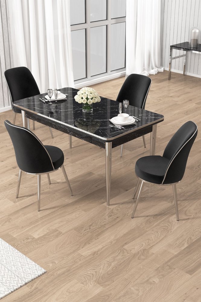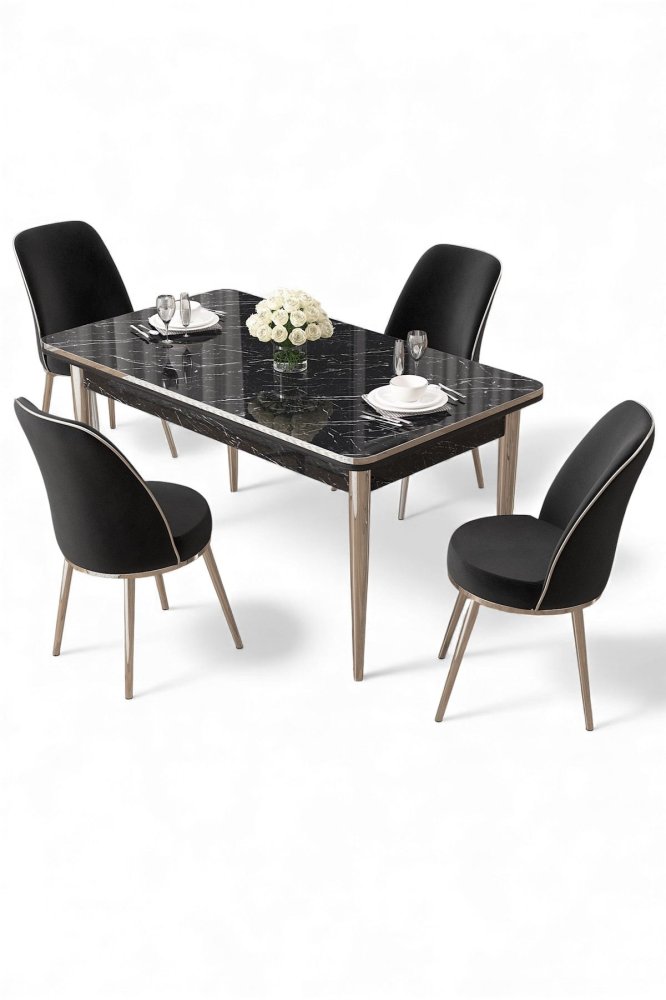 | Specifikacija | Set trpezarijskog stola i stolica (5 delova) Rewa Black Marble Chrome Black 100% Iverica sa melaminskim premazom Metalne nogare Okvir stolice: METAL Materijal: Mekana tkanina Trpezarijski sto: Širina: 110 cm Visina: 76 cm Dubina: 70 cm (1 komad) Stolica: Širina: 45 cm Visina: 91 cm Dubina: 42 cm (4 komada) Visina sedišta: 47 cm Visina nogu: 43 cm 22 DNS pena za leđa / 28 DNS pena za sedenje Broj pakovanja: 3 76,5 x 115 x 10 cm / 19,06 kg (1 komad) 77 x 58 x 49 cm / 16 kg (1 komad) 63 x 49 x 45 cm / 8 kg (1 komad) |