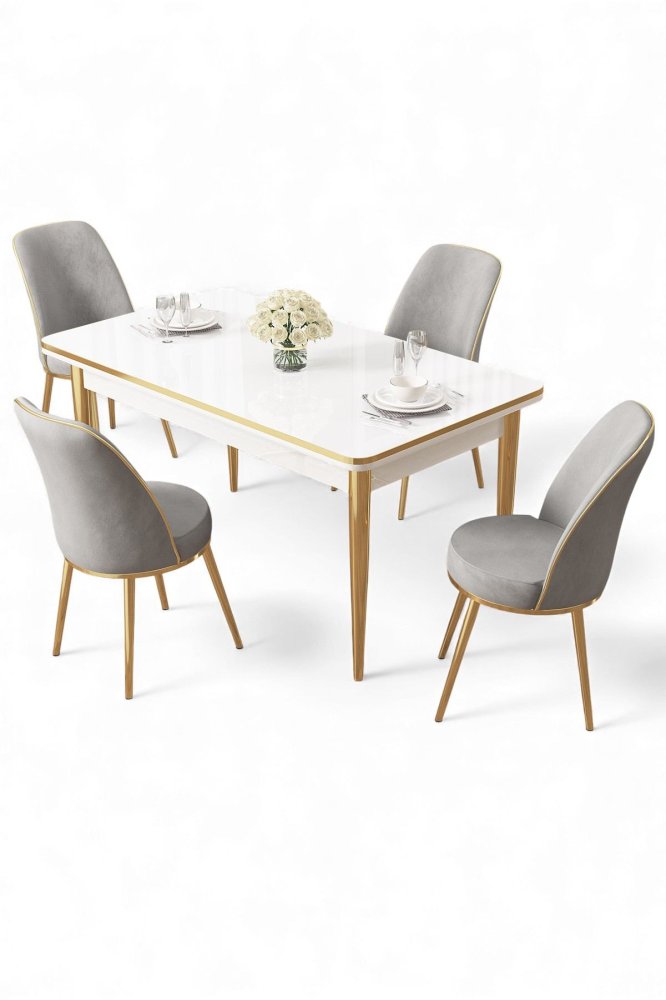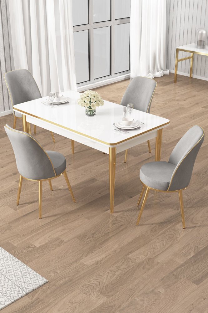 | Specifikacija | Set trpezarijskog stola i stolica (5 delova) Rewa White Gold Grey 100% Iverica sa melaminskim premazom Metalne nogare Okvir stolice: METAL Materijal: Mekana tkanina Trpezarijski sto: Širina: 110 cm Visina: 76 cm Dubina: 70 cm (1 komad) Stolica: Širina: 45 cm Visina: 91 cm Dubina: 42 cm (4 komada) Visina sedišta: 47 cm Visina nogara: 43 cm 22 DNS pena za leđa / 28 DNS pena za sedenje Broj pakovanja: 3 76,5 x 115 x 10 cm / 19,06 kg (1 komad) 77 x 58 x 49 cm / 16 kg (1 komad) 63 x 49 x 45 cm / 8 kg (1 komad) |