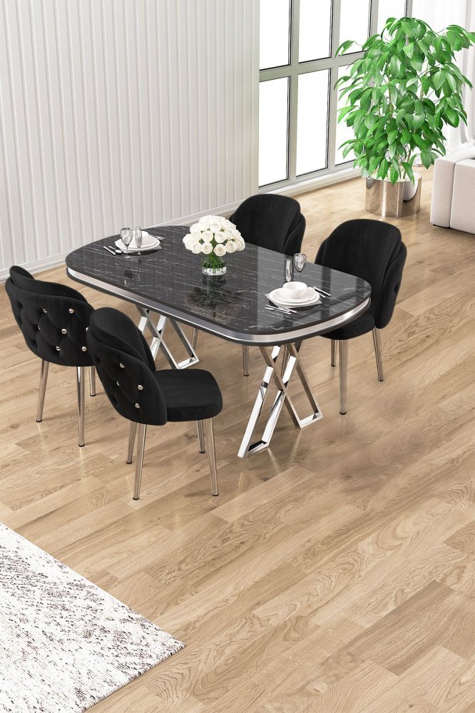 | Specifikacija | Set trpezarijskog stola i stolica (5 delova) Zae Black Marble Chrome Black 100% LAKOVANI PANEL Metalne nogare Okvir stolice: ŠPERPLOČA / METAL Materijal: Mekana tkanina Trpezarijski sto: Širina: 168 cm Visina: 76 cm Dubina: 60 cm (1 komad) Stolica: Širina: 45 cm Visina: 82 cm Dubina: 46 cm (4 komada) Visina sedišta: 48 cm 22 DNS pena za leđa / 28 DNS pena za sedenje Broj pakovanja: 4 173 x 9 x 95 cm / 25 kg (1 komad) 11 x 75 x 62 cm / 6 kg (1 komad) 85 x 59 x 50 cm / 26 kg (1 komad) 62 x 48 x 56 cm / 10 kg (1 komad) |