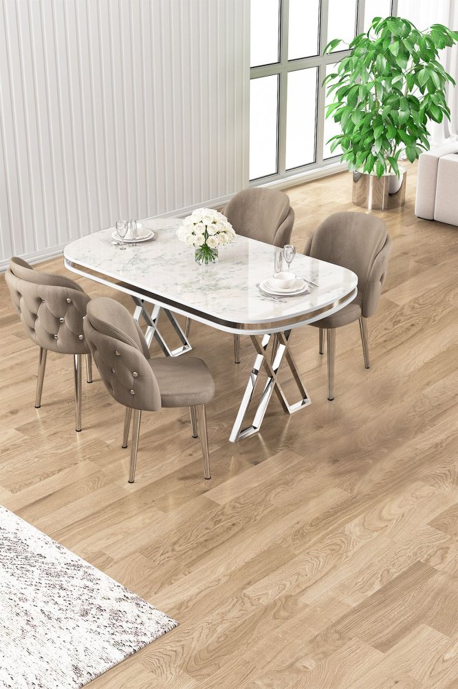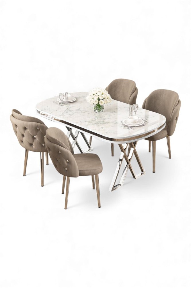 | Specifikacija | Set trpezarijskog stola i stolica (5 delova) Zae White Marble Chrome Cappuccino 100% LAKOVANI PANEL Metalne nogare Okvir stolice: ŠPERPLOČA / METAL Materijal: Mekana tkanina Trpezarijski sto: Širina: 168 cm Visina: 76 cm Dubina: 60 cm (1 komad) Stolica: Širina: 45 cm Visina: 82 cm Dubina: 46 cm (4 komada) Visina sedišta: 48 cm 22 DNS pena za leđa / 28 DNS pena za sedenje Broj pakovanja: 4 173 x 9 x 95 cm / 25 kg (1 komad) 11 x 75 x 62 cm / 6 kg (1 komad) 85 x 59 x 50 cm / 26 kg (1 komad) 62 x 48 x 56 cm / 10 kg (1 komad) |