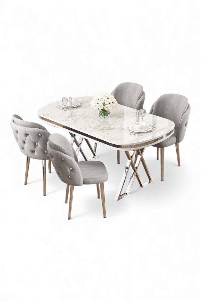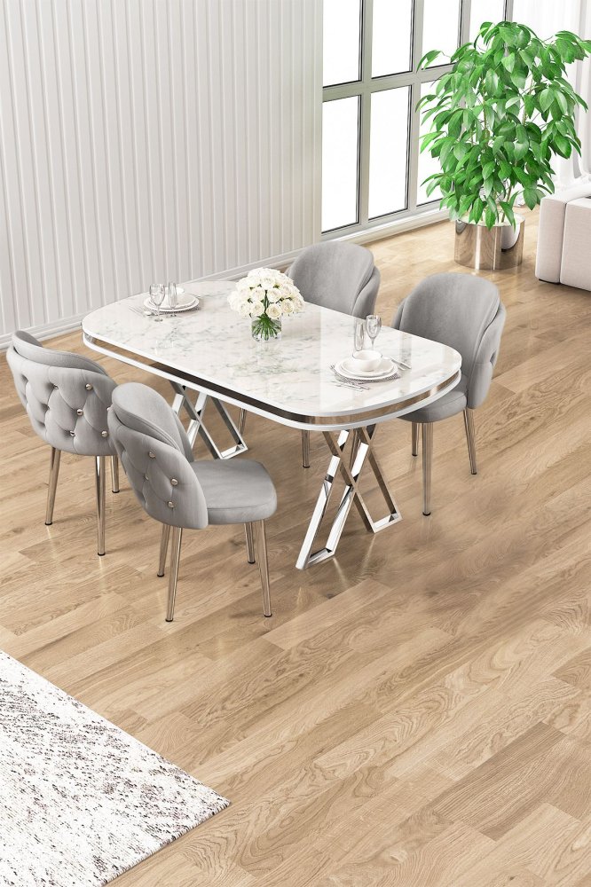| Specifikacija | Set trpezarijskog stola i stolica (5 delova) Zae White Marble Chrome Grey 100% LAKOVANI PANEL Metalne nogare Okvir stolice: ŠPERPLOČA / METAL Materijal: Mekana tkanina Trpezarijski sto: Širina: 168 cm Visina: 76 cm Dubina: 60 cm (1 komad) Stolica: Širina: 45 cm Visina: 82 cm Dubina: 46 cm (4 komada) Visina sedišta: 48 cm 22 DNS pena za leđa / 28 DNS pena za sedenje Broj pakovanja: 4 173 x 9 x 95 cm / 25 kg (1 komad) 11 x 75 x 62 cm / 6 kg (1 komad) 85 x 59 x 50 cm / 26 kg (1 komad) 62 x 48 x 56 cm / 10 kg (1 komad) |