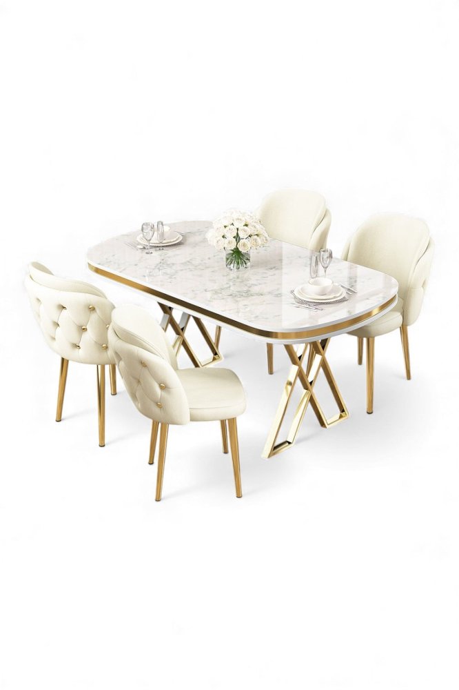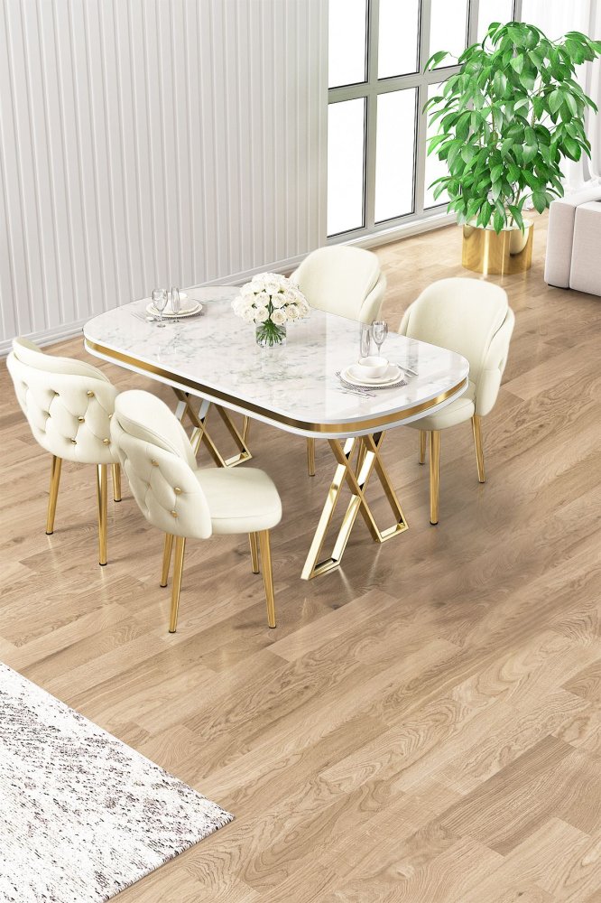 | Specifikacija | Set trpezarijskog stola i stolica (5 delova) Zae White Marble Gold Cream 100% LAKOVANI PANEL Metalne nogare Okvir stolice: ŠPERPLOČA / METAL Materijal: Mekana tkanina Trpezarijski sto: Širina: 168 cm Visina: 76 cm Dubina: 60 cm (1 komad) Stolica: Širina: 45 cm Visina: 82 cm Dubina: 46 cm (4 komada) Visina sedišta: 48 cm 22 DNS pena za leđa / 28 DNS pena za sedenje Broj pakovanja: 4 173 x 9 x 95 cm / 25 kg (1 komad) 11 x 75 x 62 cm / 6 kg (1 komad) 85 x 59 x 50 cm / 26 kg (1 komad) 62 x 48 x 56 cm / 10 kg (1 komad) |