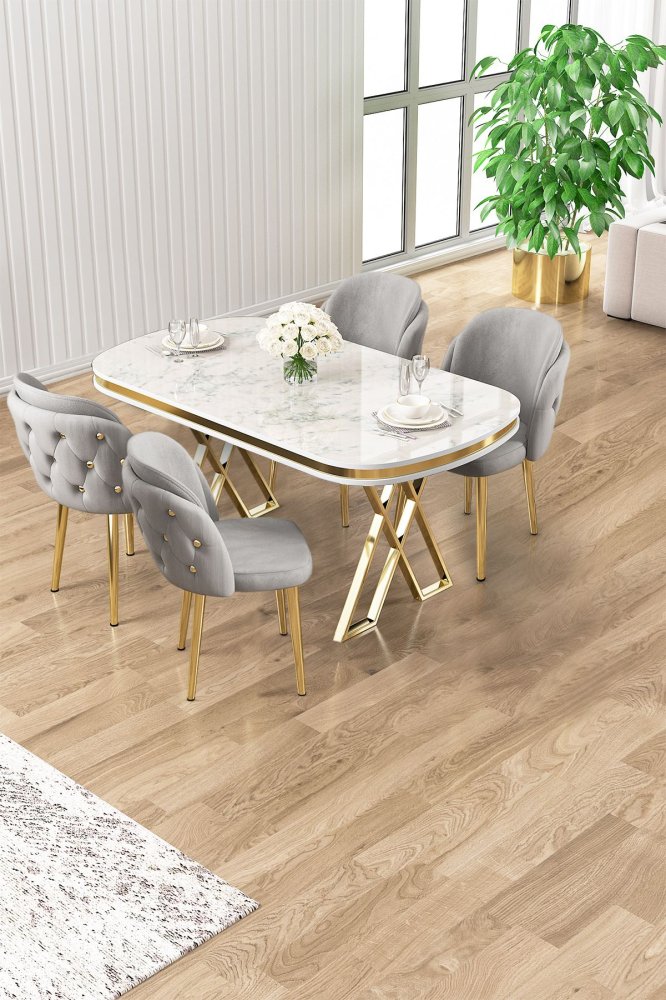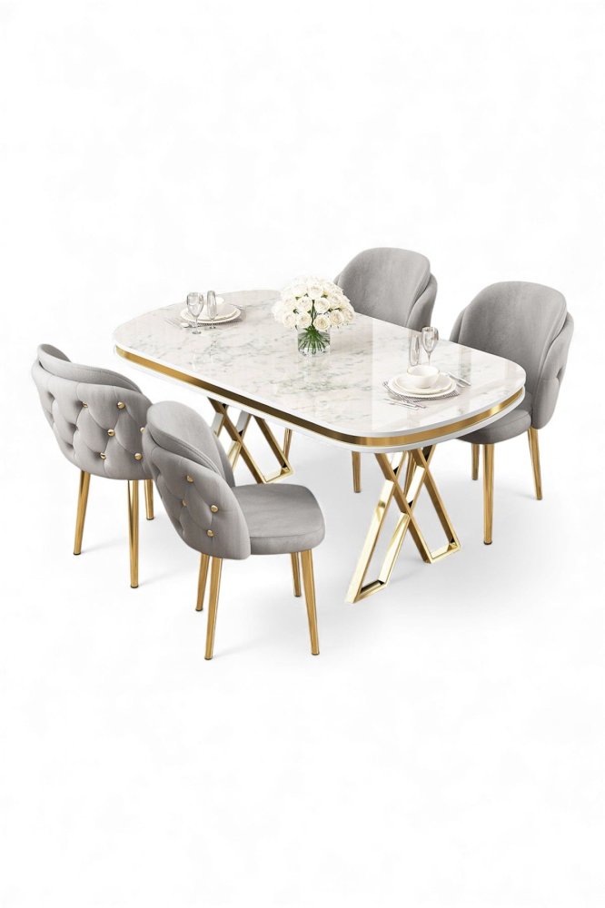 | Specifikacija | Set trpezarijskog stola i stolica (5 delova) Zae White Marble Gold Grey 100% LAKOVANI PANEL Metalne nogare Okvir stolice: ŠPERPLOČA / METAL Materijal: Mekana tkanina Trpezarijski sto: Širina: 168 cm Visina: 76 cm Dubina: 60 cm (1 komad) Stolica: Širina: 45 cm Visina: 82 cm Dubina: 46 cm (4 komada) Visina sedišta: 48 cm 22 DNS pena za leđa / 28 DNS pena za sedenje Broj pakovanja: 4 173 x 9 x 95 cm / 25 kg (1 komad) 11 x 75 x 62 cm / 6 kg (1 komad) 85 x 59 x 50 cm / 26 kg (1 komad) 62 x 48 x 56 cm / 10 kg (1 komad) |
