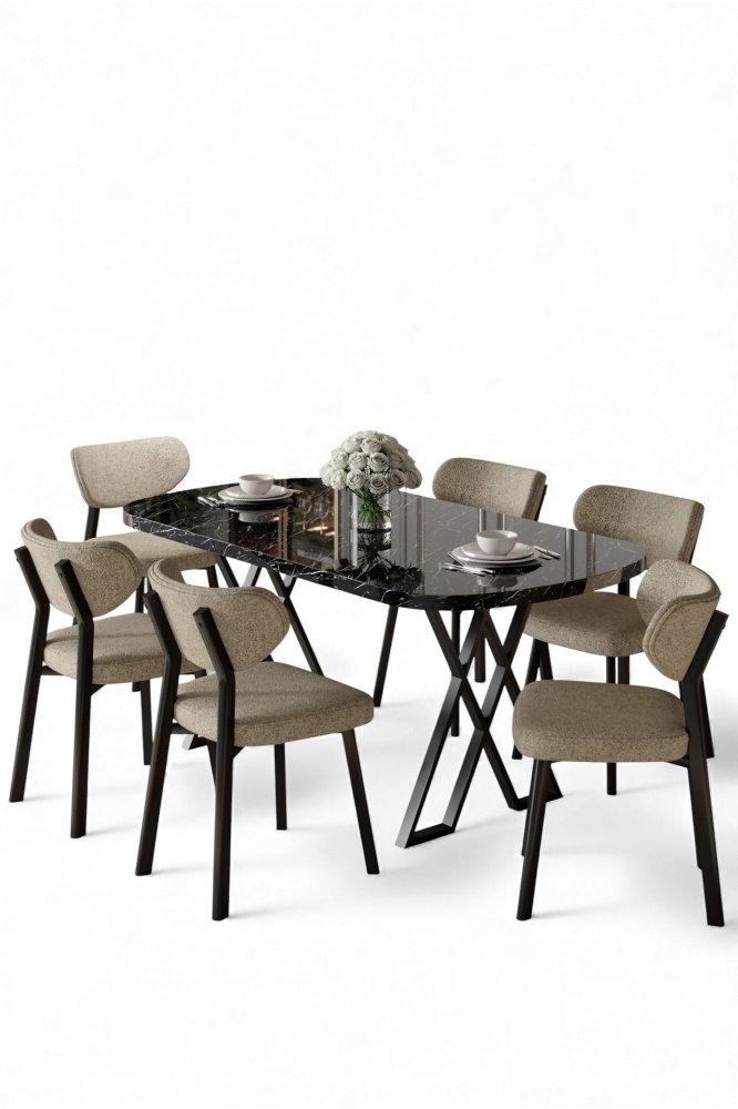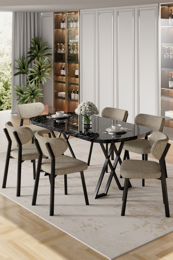 | Specifikacija | Set trpezarijskog stola i stolica (7 delova) Axton Black Marble Cappuccino 100% MDF Metalne nogare Okvir stolice: Šperploča / METAL Materijal: Bukle Trpezarijski sto: Širina: 168 cm Visina: 76 cm Dubina: 90 cm (1 komad) Stolica: Širina: 46 cm Visina: 85 cm Dubina: 45 cm (6 komada) Visina sedišta: 49 cm 22 DNS pena za leđa / 28 DNS pena za sedenje Broj pakovanja: 3 173 x 9 x 95 cm / 25 kg (1 komad) 11 x 75 x 62 cm / 6 kg (1 komad) 37 x 104 x 77 cm / 44 kg (1 komad) |