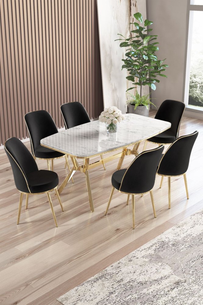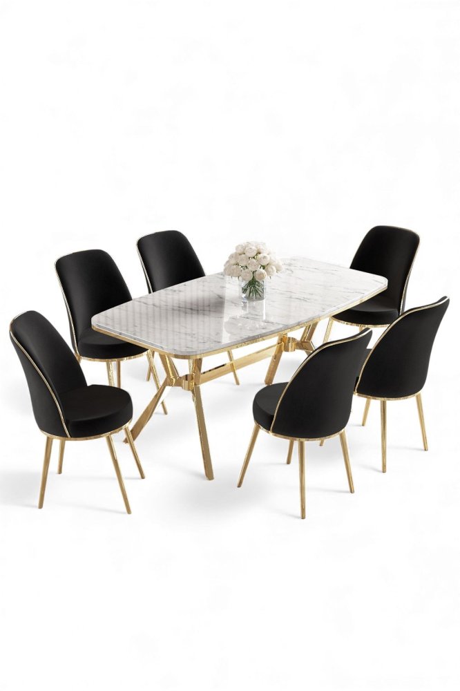 | Specifikacija | Set trpezarijskog stola i stolica (7 delova) Lena White Marble Gold Black 100% LAKOVANI PANEL Metalne nogare Okvir stolice: METAL Materijal: Mekana tkanina Trpezarijski sto: Širina: 160 cm Visina: 75 cm Dubina: 90 cm (1 komad) Stolica: Širina: 45 cm Visina: 91 cm Dubina: 42 cm (6 komada) Visina sedišta: 47 cm Visina nogara: 43 cm 22 DNS pena za leđa / 28 DNS pena za sedenje Broj pakovanja: 4 169 x 99,5 x 10,5 cm / 25,76 kg (1 komad) 37,5 x 80 x 19 cm / 7,58 kg (1 komad) 85 x 59 x 50 cm / 24 kg (1 komad) 62 x 48 x 56 cm / 12,5 kg (1 komad) |