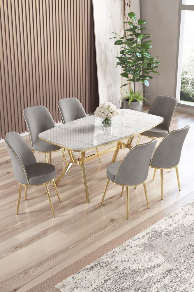 | Specifikacija | Set trpezarijskog stola i stolica (7 delova) Lena White Marble Gold Grey 100% LAKOVANI PANEL Metalne nogare Okvir stolice: METAL Materijal: Mekana tkanina Trpezarijski sto: Širina: 160 cm Visina: 75 cm Dubina: 90 cm (1 komad) Stolica: Širina: 45 cm Visina: 91 cm Dubina: 42 cm (6 komada) Visina sedišta: 47 cm Visina nogara: 43 cm 22 DNS pena za leđa / 28 DNS pena za sedenje Broj pakovanja: 4 169 x 99,5 x 10,5 cm / 25,76 kg (1 komad) 37,5 x 80 x 19 cm / 7,58 kg (1 komad) 85 x 59 x 50 cm / 24 kg (1 komad) 62 x 48 x 56 cm / 12,5 kg (1 komad) |