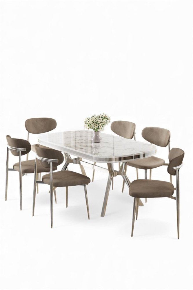 | Specifikacija | Set trpezarijskog stola i stolica (7 delova) Olya White Marble Chrome Cappuccino 100% LAKOVANI PANEL Metalne nogare Okvir stolice: ŠPERPLOČA / METAL Materijal: Mekana tkanina Trpezarijski sto: Širina: 168 cm Visina: 75 cm Dubina: 90 cm (1 komad) Stolica: Širina: 48 cm Visina: 84 cm Dubina: 49 cm (6 komada) Visina sedišta: 48 cm 22 DNS pena za leđa / 28 DNS pena za sedenje Broj pakovanja: 3 173 x 9 x 95 cm / 25 kg (1 komad) 37,5 x 80 x 19 cm / 7,58 kg (1 komad) 55 x 115 x 68 cm / 45 kg (1 komad) |