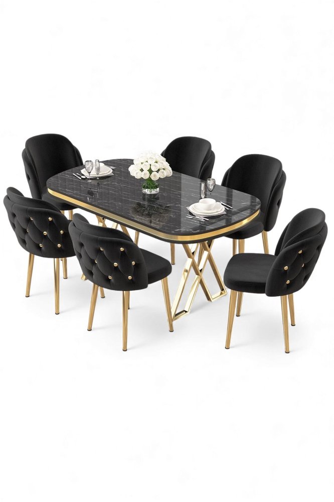 | Specifikacija | Set trpezarijskog stola i stolica (7 delova) Zae Black Marble Gold Black 100% LAKOVANI PANEL Metalne nogare Okvir stolice: ŠPERPLOČA / METAL Materijal: Mekana tkanina Trpezarijski sto: Širina: 168 cm Visina: 76 cm Dubina: 60 cm (1 komad) Stolica: Širina: 45 cm Visina: 82 cm Dubina: 46 cm (6 komada) Visina sedišta: 48 cm 22 DNS pena za leđa / 28 DNS pena za sedenje Broj pakovanja: 5 173 x 9 x 95 cm / 25 kg (1 komad) 11 x 75 x 62 cm / 6 kg (1 komad) 85 x 59 x 50 cm / 26 kg (1 komad) 62 x 48 x 56 cm / 12 kg (1 komad) 62 x 48 x 56 cm / 14 kg (1 komad) |