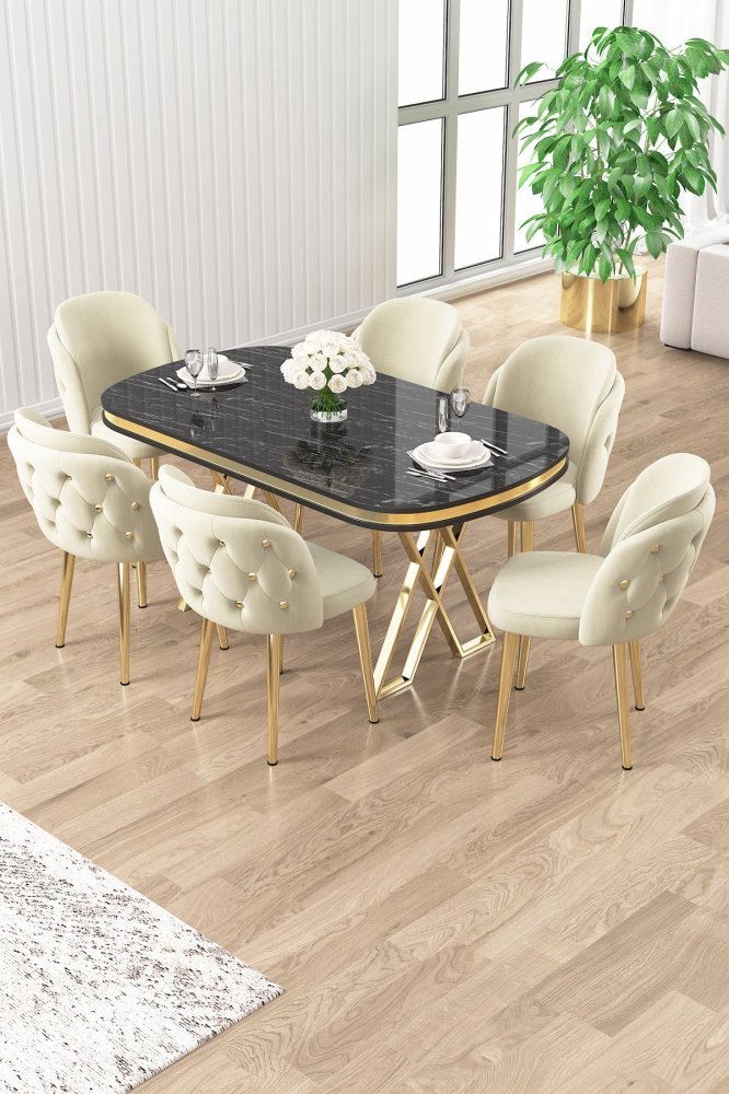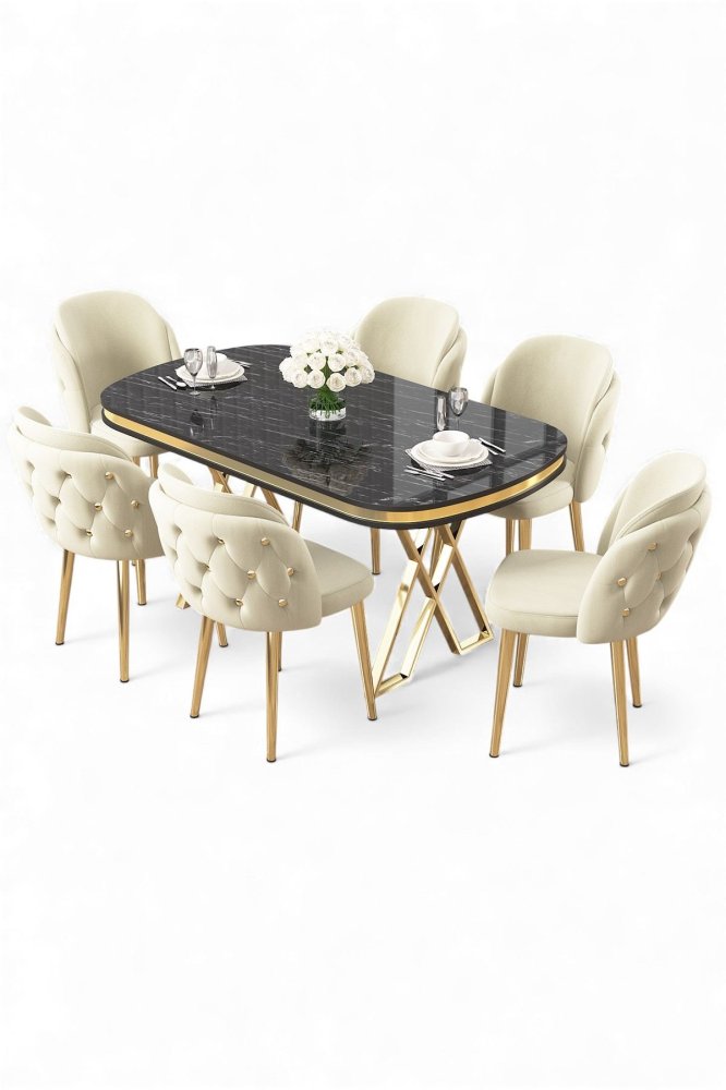 | Specifikacija | Set trpezarijskog stola i stolica (7 delova) Zae Black Marble Gold Cream 100% LAKOVANI PANEL Metalne nogare Okvir stolice: ŠPERPLOČA / METAL Materijal: Mekana tkanina Trpezarijski sto: Širina: 168 cm Visina: 76 cm Dubina: 60 cm (1 komad) Stolica: Širina: 45 cm Visina: 82 cm Dubina: 46 cm (6 komada) Visina sedišta: 48 cm 22 DNS pena za leđa / 28 DNS pena za sedenje Broj pakovanja: 5 173 x 9 x 95 cm / 25 kg (1 komad) 11 x 75 x 62 cm / 6 kg (1 komad) 85 x 59 x 50 cm / 26 kg (1 komad) 62 x 48 x 56 cm / 12 kg (1 komad) 62 x 48 x 56 cm / 14 kg (1 komad) |