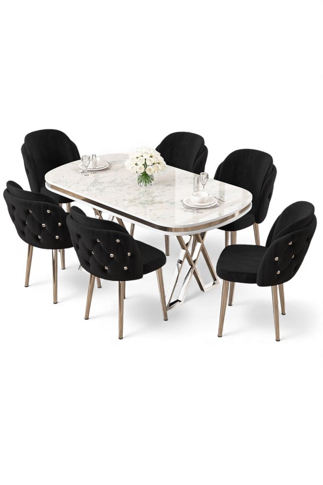 | Specifikacija | Set trpezarijskog stola i stolica (7 delova) Zae White Marble Chrome Black 100% LAKOVANI PANEL Metalne nogare Okvir stolice: ŠPERPLOČA / METAL Materijal: Mekana tkanina Trpezarijski sto: Širina: 168 cm Visina: 76 cm Dubina: 60 cm (1 komad) Stolica: Širina: 45 cm Visina: 82 cm Dubina: 46 cm (6 komada) Visina sedišta: 48 cm 22 DNS pena za leđa / 28 DNS pena za sedenje Broj pakovanja: 5 173 x 9 x 95 cm / 25 kg (1 komad) 11 x 75 x 62 cm / 6 kg (1 komad) 85 x 59 x 50 cm / 26 kg (1 komad) 62 x 48 x 56 cm / 12 kg (1 komad) 62 x 48 x 56 cm / 14 kg (1 komad) |