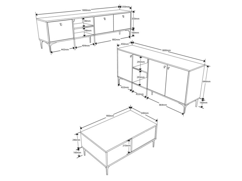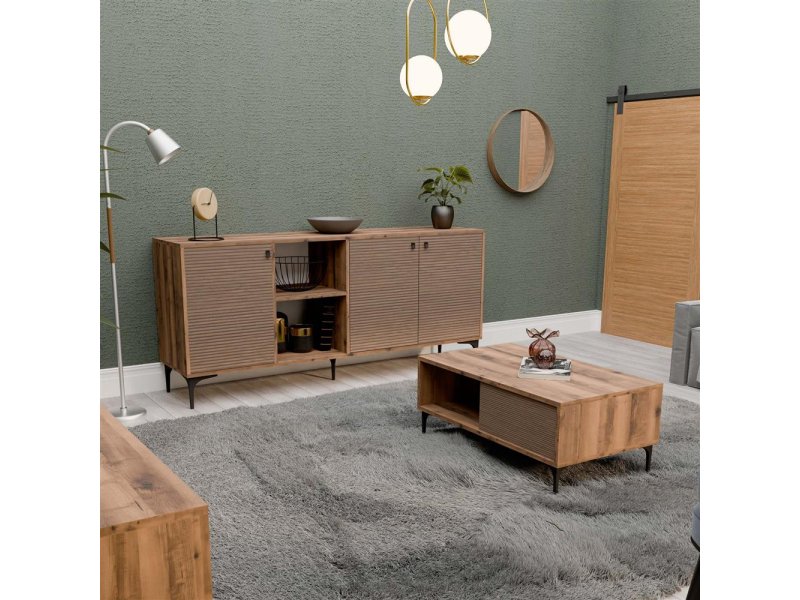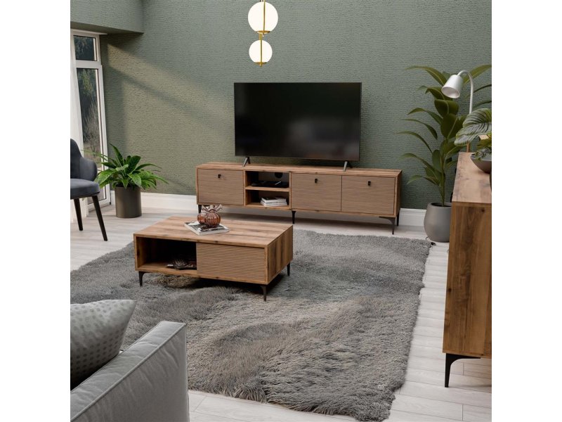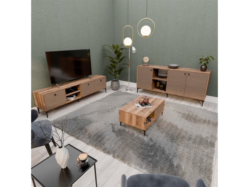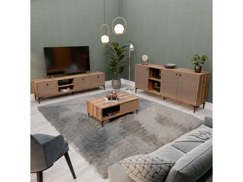 Specifikacija | Set nameštaja za dnevnu sobu Materijal: 100% Iverica presvučena melaminom Dimenzije stola: Širina: 90 cm Visina: 40,6 cm Dubina: 54 cm Dimenzije komode: Širina: 180 cm Visina: 80 cm Dubina: 45 cm Dimenzije TV stalka: Širina: 180 cm Visina: 51 cm Dubina: 35 cm Ostalo: Više polica Može se fiksirati za zid |