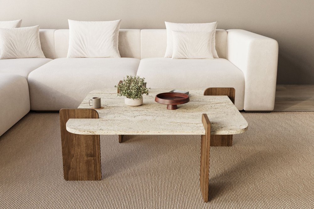 Kombinacija travertin dekora (svetli, kameni tonovi) i walnut drveta (topli braon tonovi) stvara elegantan kontrast i unosi prirodnu notu u enterijer.