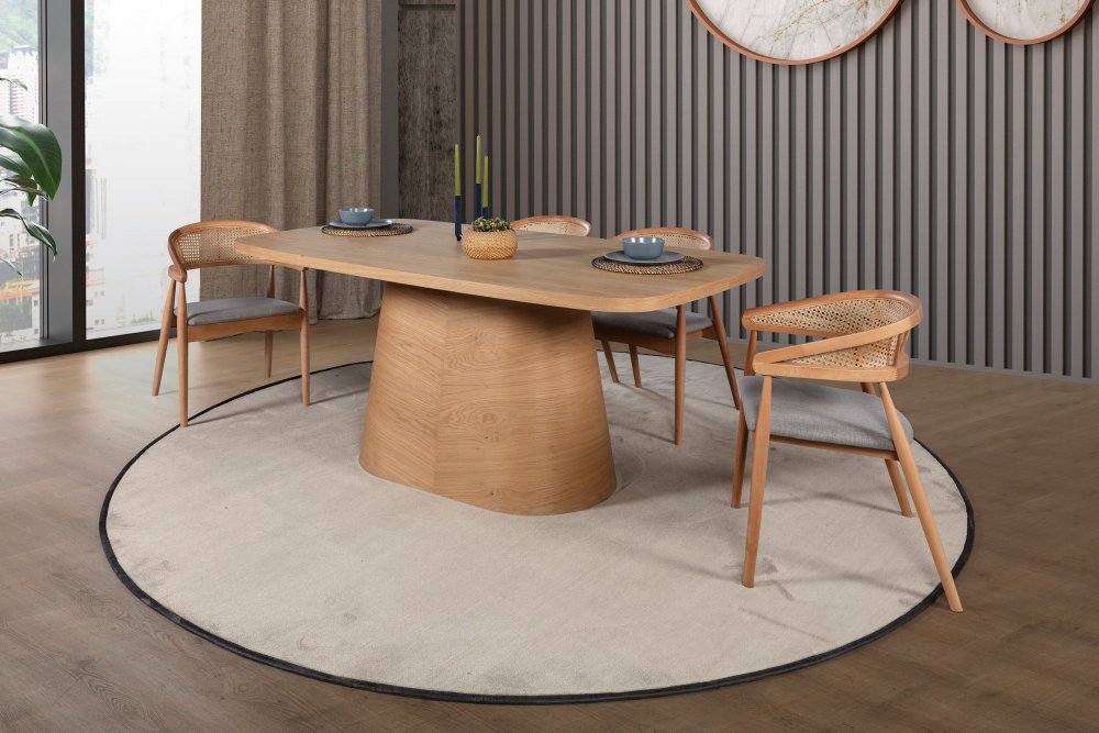 | Specifikacija | Trpezarijski set Materijal stola: Drvo (hrast) Materijal stolica: Drvo (bukva) Materijal tkanine: Poliester Dimenzije trpezarijskog stola: Širina: 190 cm Visina: 75 cm Dubina: 100 cm Dimenzije stolice (4x): Širina: 54 cm Visina: 78 cm Dubina: 49 cm |