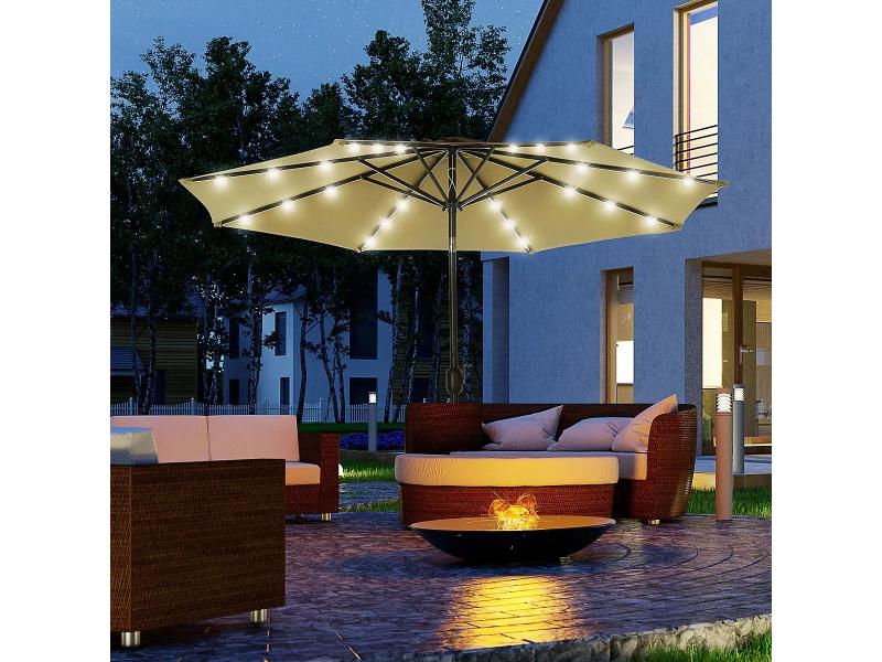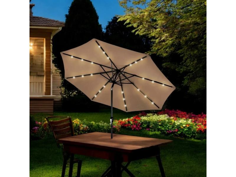 | Karakteristike | Idealan za terasu, dvorište, bazen, baštu, palubu ili baštenski sto. Suncobran je opremljen sa LED svetlima na solarni pogon. Ova energetski efikasna rasveta automatski stvara prijatnu atmosferu u večernjim satima i idealna je za opuštanje na terasi ili u dvorištu. Suncobran ima 32 LED lampice raspoređene duž rebara, koje se napajaju putem solarnog panela na vrhu. Nakon punjenja na suncu, svetla mogu raditi 9–12 sati, bez potrebe za kablovima ili dodatnim izvorom energije Suncobran ima prekidač za uključivanje/isključivanje solarne rasvete i praktičan mehanizam za otvaranje pomoću ručice.