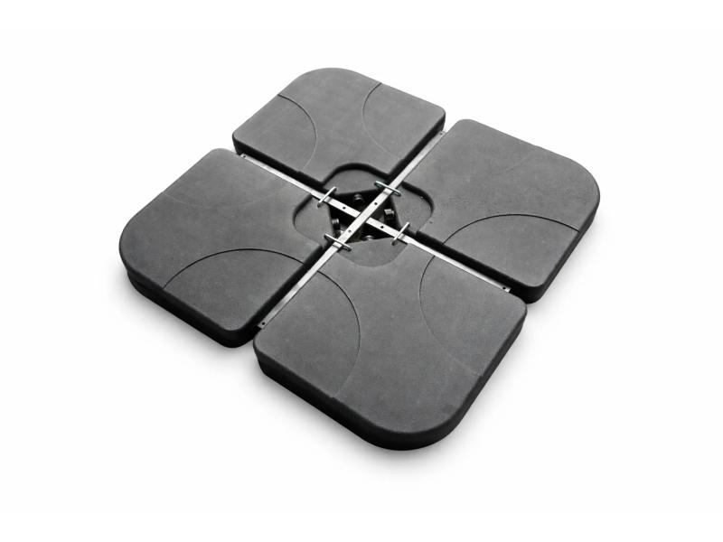 Postolje za suncobran u setu od 4 dela pruža pouzdanu stabilnost i sigurnost prilikom korišćenja suncobrana na terasi, u dvorištu ili bašti. Svaki segment se puni vodom ili peskom, pri čemu se za maksimalnu stabilnost preporučuje punjenje peskom. Modularni dizajn omogućava jednostavno postavljanje oko stuba suncobrana, dok ravna forma obezbeđuje uredan i diskretan izgled prostora.