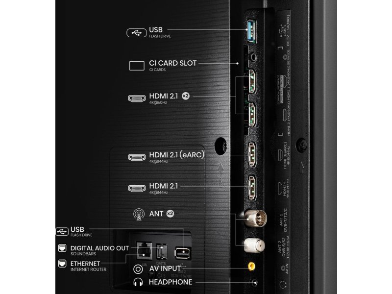 | Priključci / Slotovi | HDMI: 4 (1 x HDMI 2.1 sa eARC i 144 Hz, 1 x HDMI 2.1 sa 144 Hz, 2 x HDMI 2.0 sa 60 Hz) USB: 2 LAN (RJ-45): Da Wi-Fi: Da Bluetooth: Da Optički audio izlaz: Da Izlaz za slušalice: Da CI+ slot: Da |