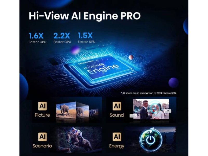 | Ekran | Dijagonala ekrana 85 inča (216 cm) Rezolucija 3840 × 2160 piksela 4K Ultra HD Tip panela Mini-LED sa Full Array Local Dimming Ugao gledanja 178° horizontalno i vertikalno Osvetljenost do 5000 nita maksimalna Tehnologije QLED Quantum Dot, Mini-LED PRO, Hi-View AI Engine PRO Podrška za deljenje ekrana Da, sa mobilnim uređajem i računarom Podrška za bežičnu tastaturu i miša Da |