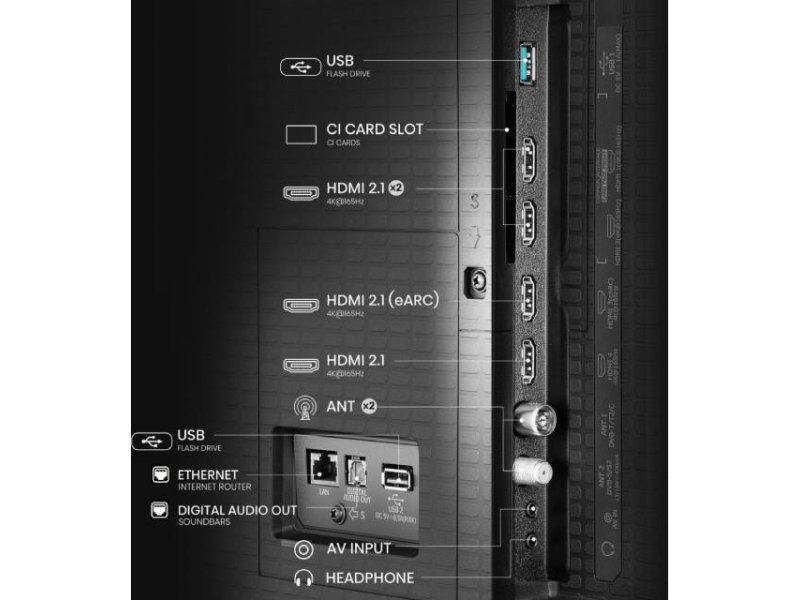| Priključci / Slotovi | HDMI 3 × HDMI 2.1 USB 2 Ethernet Da Audio izlaz slušalice Da CI+ slot Da RF ulaz Da Optički audio izlaz Da |