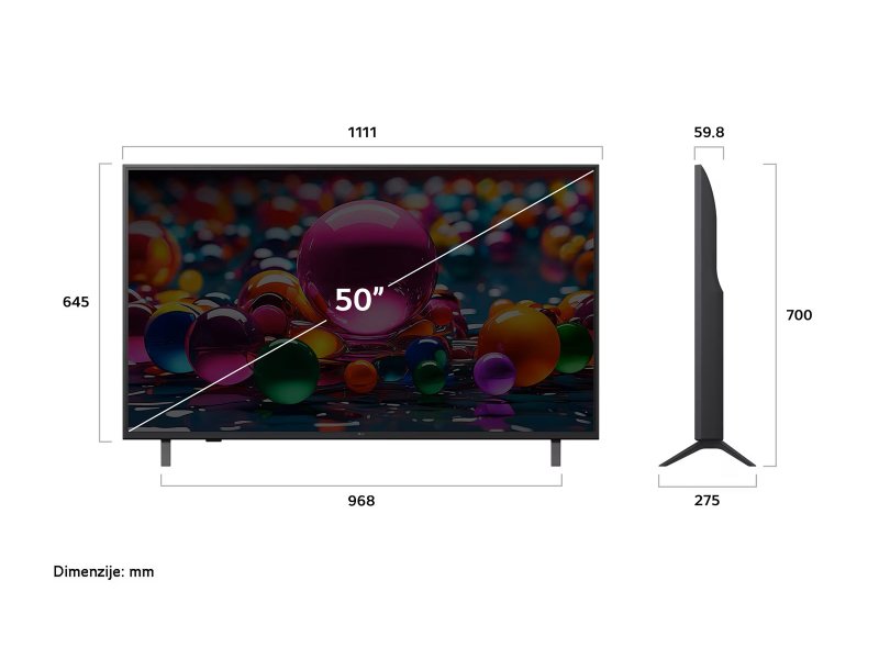 | Smart funkcije | Operativni sistem: webOS 25 Pametno prepoznavanje glasa Smartphone Remote App: LG ThinQ Full Web Browser Multi View Kompatibilnost sa USB kamerom Radi sa Apple Home Home Hub AI Chatbot Google Home / Hub Google Cast Radi sa Apple Airplay |