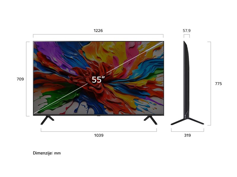 | Ekran | Dijagonala ekrana: 55" Rezolucija: 4K Ultra HD 3840 x 2160 Tip ekrana: 4K QNED MiniLED Osvežavanje ekrana: 120Hz Native (VRR 144Hz) Tip pozadinskog osvetljenja: Mini LED Wide Color Gamut: Dynamic QNED Color |