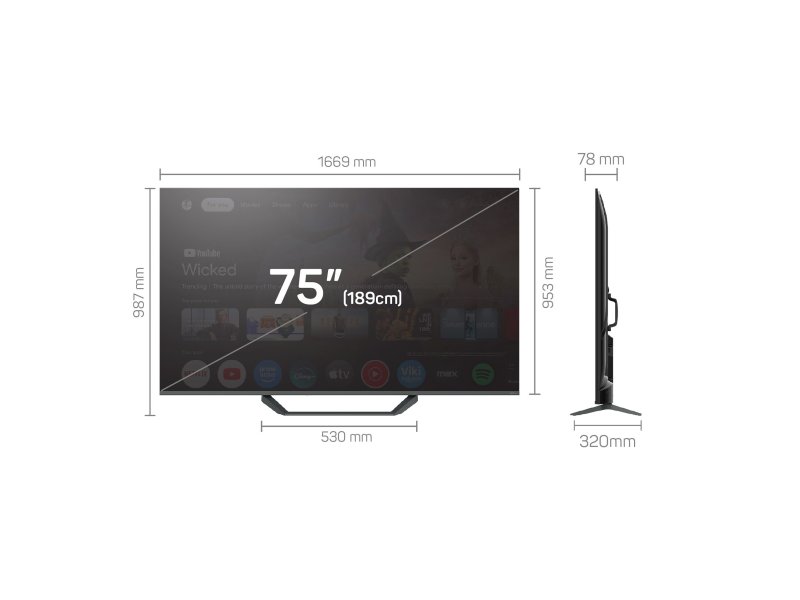 | Ekran | Veličina ekrana: 75” (189 cm) Tip ekrana: QLED, 10bit, VA Rezolucija ekrana: 4K UHD (3840 x 2160) Osvežavanje ekrana: 60Hz Osvetljenost: 300 cd/m² Dinamički contrast: 6000:1 Ugao gledanja: 170°/170° Vreme odziva: 6.5 ms |