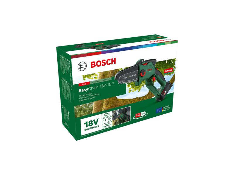 Akumulatorska EasyChain 18V-15-7 se brzo probija kroz gusto granje. Laka za podešavanje uz SDS sistem sklapanja bez upotrebe alata, ova testera doprema performanse orezivanja velike brzine od 6,95 m/s, dok Oregon lanac visokog kvaliteta seče drvo prečnika do 13 cm. Kompaktna veličina, dobro izbalansiran dizajn i meki rukohvati omogućavaju rad bez napora uz ovaj lagani alat. Obavljanje svih zadataka orezivanja i testerisanja za tren oka uz impresivnih 160 rezova po punjenju (sa akumulatorom od 2,5 Ah). Integrisana Bosch Syneon tehnologija pruža optimalnu snagu i maksimalno vreme rada. Alat pripada sistemu 18V POWER FOR ALL. Za sve 18V POWER FOR ALL alate može se koristiti jedan akumulator.