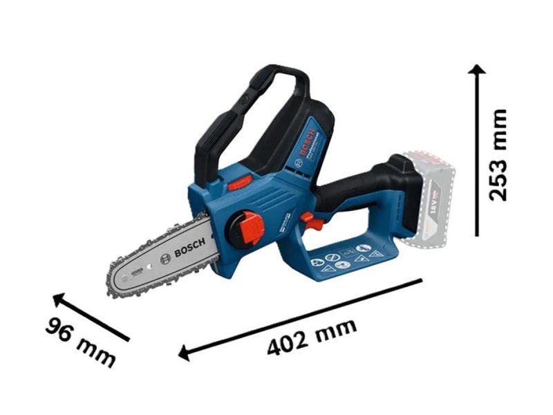 | Karakteristike | Preporuka za akumulator: ≥4.0Ah Korak lanca: 3/8" (9.52 mm) Brzina lanca: 7,2 m/s Debljina pogonskog članka: 1,1 mm Nivo zvučnog pritiska: 84 dB(A) Nivo zvučne snage: 90 dB(A) Obim isporuke: Bosch GKE 18V-15 Korice reznog alata 15 cm |