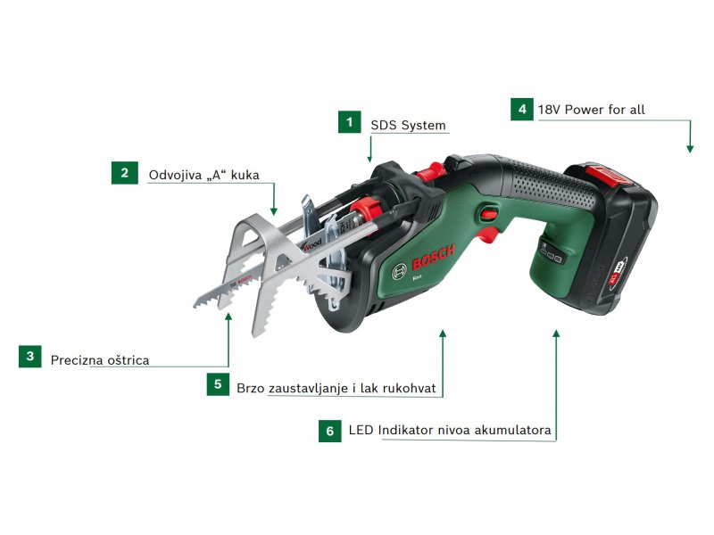 | Karakteristike | Tehnički podaci: Tip akumulatora Litijum-jonski Napon akumulatora 18 V Kapacitet sečenja (sa polugom za držanje „A-Grip“ Ø 60 mm Kapacitet sečenja (bez poluge za držanje „A-Grip“) Ø 80 mm Rezova po punjenju akumulatora do 115 Dužina lista testere 150 mm Nivo zvučnog pritiska 74 dB Dužina 370 mm Širina 81 mm Visina 138 mm Vreme punjenja akumulatora 1 h |