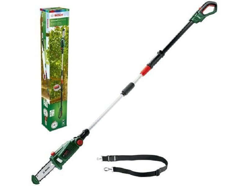 | Karakteristike | Karakteristike: Tip akumulatora Litijum-jonski akumulator Napon akumulatora 18 V Vreme punjenja akumulatora 1 h Rezervoar za ulje 60 ml Dužina mača 20 cm Brzina lanca 4 m/s Debljina pogonskog članka 1,1 mm Podešavanje visine 210 – 260 cm Dužina rezanja 15 cm Zakretna glava 120 ° Nivo zvučnog pritiska 78 dB Nivo zvučnge snage 92 dB Težina (sa lancem, mačem i akumulatorom) 3,6 kg Funkcije: Automatsko podmazivanje Štitnik vrha noža |