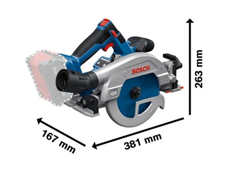 | Karakteristike | Napon akumulatora: 18 V Prečnik lista testere: 165 mm Broj obrtaja u praznom hodu: 5.000 min⁻¹ Prečnik unutrašnjeg otvora lista testere: 20 mm Masa bez akumulatora: 3,4 kg Obim isporuke: Bosch 18V-57-2 GX Paralelni graničnik |