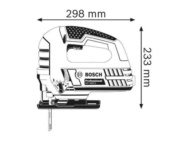 | Karakteristike | Nominalna ulazna snaga: 710 W Testera, dužina hoda: 20 mm Broj hodova u praznom hodu: 800 - 3.100 min⁻¹ Broj obrtaja u praznom hodu: 3.100 min⁻¹ Ugao nagiba: 45° Težina: 2.5 kg Obim isporuke: Bosch GST 8000 E Zaštita od kidanja materijala 1 x list ubodne testere T 144 D, Speed for Wood |
