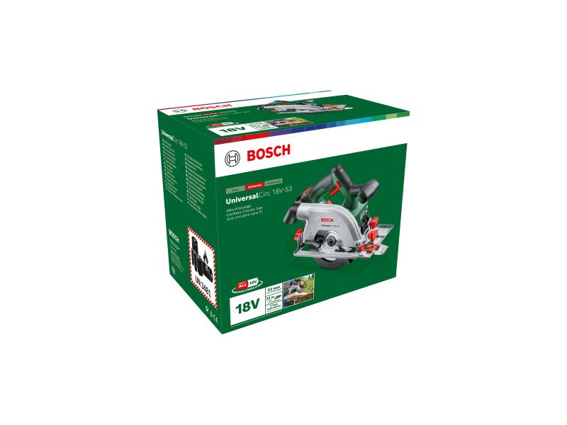 Akumulatorska UniversalCirc 18V-53 je kružna testera koja je najbolja u klasi za širok spektar poslova na samostalnim projektima obrade drveta. Ima dubinu rezanja od 53 mm za precizno sečenje drveta, iverice i drugih materijala od drveta. List testere od 160 mm visokog kvaliteta sa 24 zupca od tvrdog metala i robusnim aluminijumskim gornjim štitnikom obezbeđuju precizno i snažno sečenje. Hobi stolari će biti impresionirani velikim kapacitetom sečenja od 33 m iverice debljine 19 mm po punjenju akumulatora (2,5 Ah). Ovaj alat je kompatibilan sa Bosch Home & Garden sistemom vođice, što obezbeđuje optimalnu preciznost, naročito za duge rezove. A za čist radni prostor, moguće je priključiti usisivač radi skupljanja više od 90% prašine. Alat pripada sistemu 18V POWER FOR ALL. Za sve 18V POWER FOR ALL alate može se koristiti jedan akumulator.
