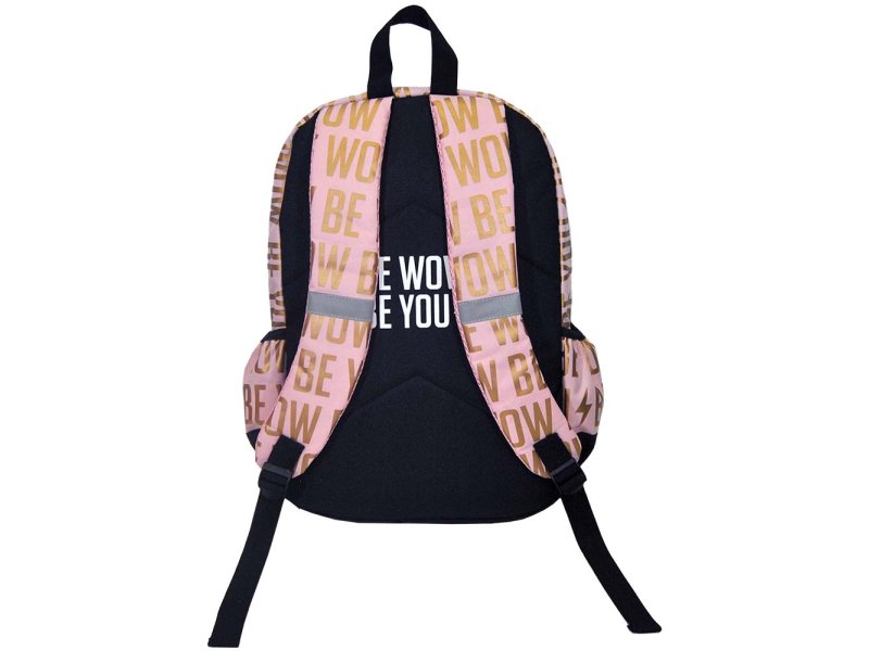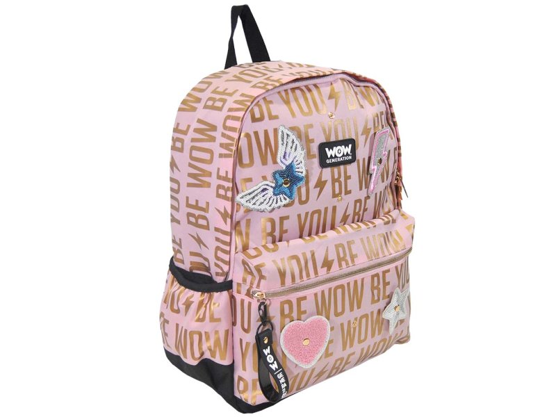| Karakteristike |   Wow ranac u nežnoj roze boji sa zlatnim printom savršen je modni dodatak koji možete koristiti za školu ili trening! Uz ranac dolaze 4 šarene aplikacije koje se mogu kačiti na ranac i menjati po želji. Praktičan i moderan – ima dve bočne pregrade i prednji džep za sve sitnice. Ručke na rancu su dodatno ojačane, za veću udobnost prilikom nošenja ranca na leđima. Roze ranac sa zlatnim printom, uz ranac dolazi i 4 aplikacije koje možete zakačiti na ranac. Ranac ima dve pregrade sa strane, i napred džep. Dimenzije ranca: 43x30x10cm.  |
