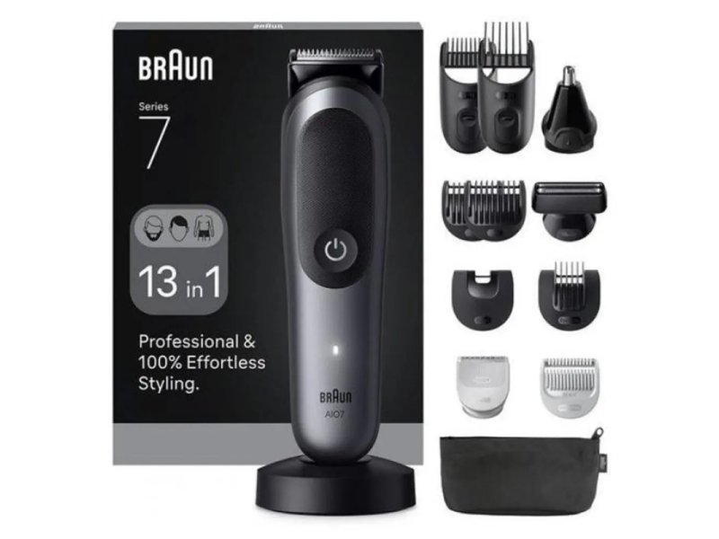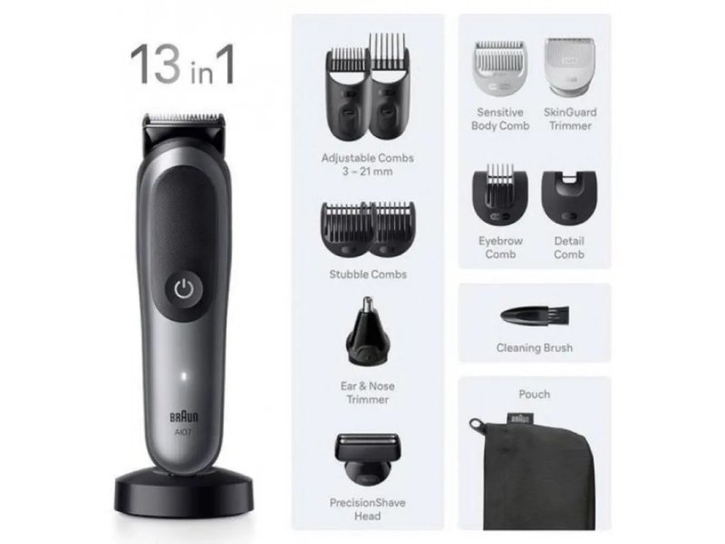 | Fizičke karakteristike | Vodootporan Da Boja Crna Napajanje Punjiva baterija Dimenzije (ŠxVxD) 4.2 x 15.6 x 4.1 cm Masa 141 g Namenjeno za bradu, telo, kosu i lice Oprema 1 x Klizni češalj za bradu 3-11 mm 1 x Klizni češalj za kosu 13-21 mm 1 x Široki brijač sa mrežicom 1 x Trimer za uši i nos 1 x Glava za negu tijela 1 x Osetljivi češalj za telo 1 x Fiksni češljevi sa 1 mm i 2 mm 1 x Češalj za obrve 1 x Češalj za detalje 1 x Torbica sa patentnim zatvaračem 1 x Stalak za punjenje 1 x Četka za čišćenje 1 x Punjač |
