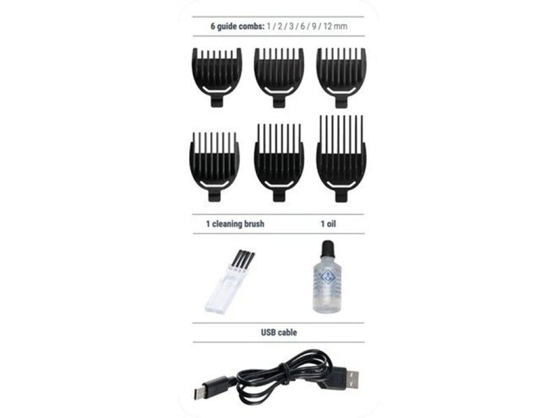 | Fizičke karakteristike | Veličina dodataka za šišanje: 1 / 2 / 3 / 6 / 9 / 12 mm; Pribor: 6 dodataka za šišanje, 1 ulje, 1 četkica za čišćenje USB kabl. |