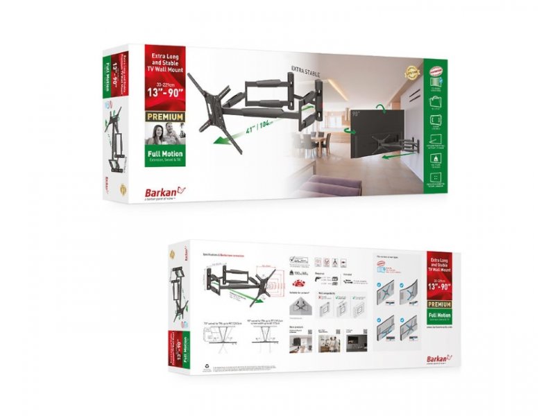 | Karakteristike | Tip: Zidni nosač za televizore Montiranje: VESA 100mm x 100mm, 100mm x 200mm, 200mm x 100mm, 200mm x 200mm, 300mm x 300mm, 300mm x 400mm, 400mm x 200mm, 400mm x 300mm, 400mm x 400mm, 600mm x 400mm, 75mm x 75mm Podržane dijagonale: 13" - 90" Nosivost: do 60kg Rastojanje od zida: 101mm Dodatne mogućnosti: Swivel, Tilt Uglovi pomeranja: Swivel ±90°, Tilt -5° +15° |