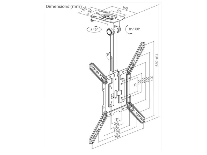 | Karakteristike | - Plafonski nosac za televizor sa potpunim pokretom - Podrzava vecinu LCD televizora od 23 do 55 - VESA kompatibilno, maks. 400 mm x 400 mm - Omogucava okretanje do 90 stepeni i naginjanje do 90 stepeni - Udaljenost od plafona: 83 mm (sklopljeno) - Podržava televizore do 20 kg - Ukljucen sav potreban materijal za montazu Materijal: celik Povrsinska zavrsna obrada: praskasti premaz Boja: crna Odgovara velicini ekrana: 23 - 55 inča VESA podrska: 75x75, 100x100, 100x200, 200x100, 200x200, 200x300, 300x200, 200x400, 400x200, 300x300, 300x400, 400x300, 400x400 Nosivost: 20 kg Udaljenost od plafona: 83 mm (sklopljeno) Opseg podesavanja visine: 520 - 614 mm Nagib opseg: +0 / -80 Optem okretanja: +45 / -45 Upravljanje kablovima: Ne Neto tezina: 2,2 kg Dimenzije: 614 x 435 x 165 mm |