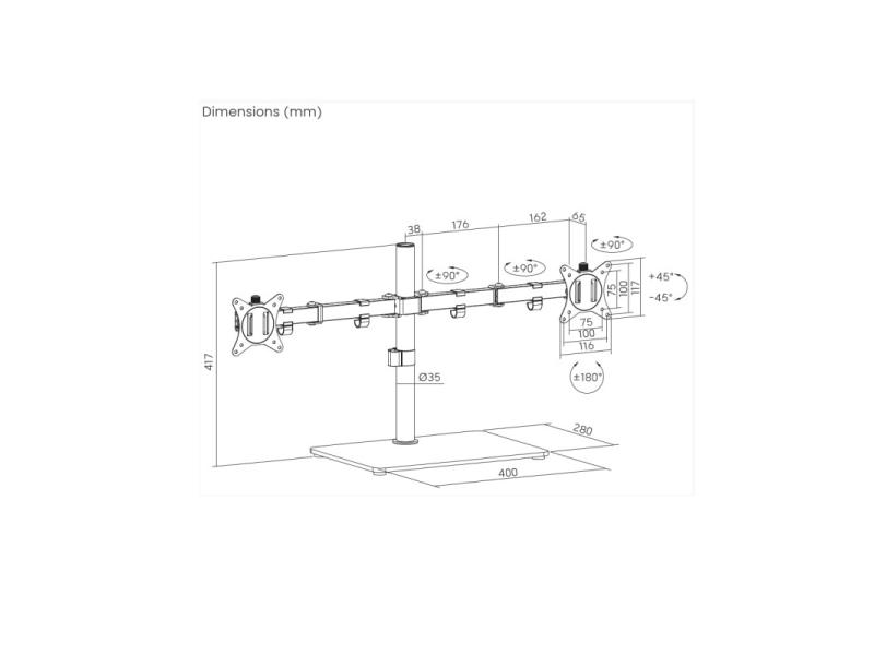 | Karakteristike | Stilan dizajn sa postoljem od kaljenog stakla Savršeno pozicionirajte ekran Lagan i nagibni dizajn - Nosac za sto za monitor sa dvostrukim krakom za monitor - Krakovi omogucavaju okretanje, produzavanje, uvlacenje ili naginjanje ekrana i omogucavaju rotiranje ekrana iz pejzaznog u portretni rezim itd. - Radi sa skoro svim LCD monitorima (maks. 32") - Stabilna staklena podloga za sigurno postavljanje na bilo koji sto - Ugradjeno upravljanje kablovima za organizovan i uredan radni prostor - VESA kompatibilno, maks. 100 x 100 mm Materijal: Celik, plastika, kaljeno staklo Površinska završna obrada: praskasti premaz Boja: fino teksturirana crna Podrzana velicina ekrana: 17" - 32" Nosivost (po ekranu): 9 kg VESA kompatibilno: 100x100, 75x75 mm Opseg nagiba: +45° ~ -45° Opseg okretanja: +90° ~ -90° Rotacija ekrana: +180° ~ -180° Upravljanje kablovima: da Neto tezina: 4,95 kg |