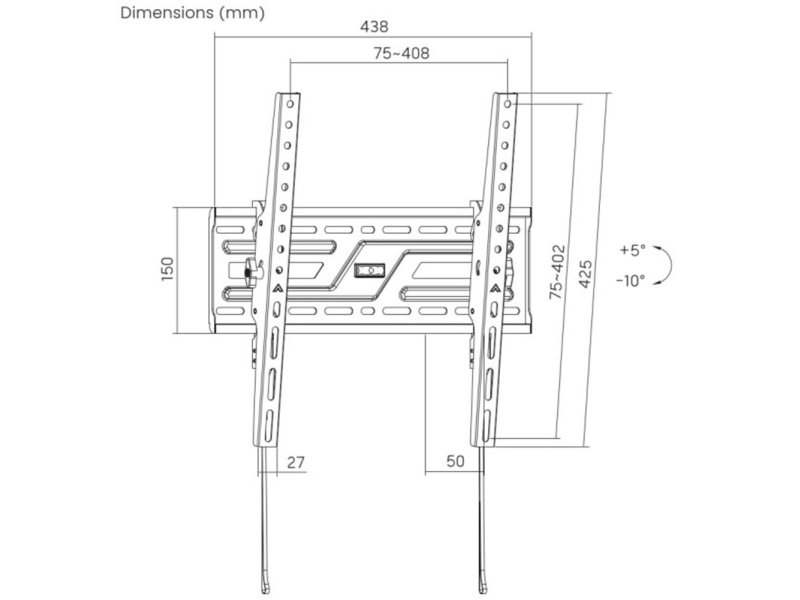 | Karakteristike | Podržana veličina ekrana: 37"- 75" VESA kompatibilnost: 75x75, 100x100, 100x150, 150x100, 100x200, 200x100, 150x150, 200x200, 200x300, 300x200, 200x400, 400x200, 300x300 300x400, 400x300, 400x400 Nosivost: 75 kg Profil: 50 mm Opseg nagiba: 5° / -10° Montaža: Puni zid, dvostruki stub (406 mm) Materijal: Čelik Površinska završna obrada: Praškasti premaz Boja: Crna sa finom teksturom |