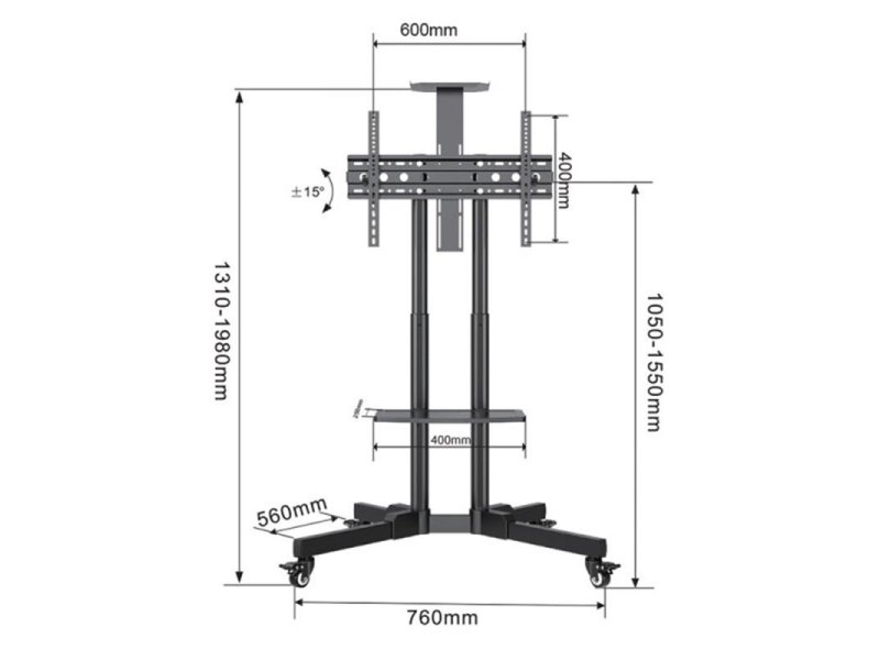 | Karakteristike | Tip: Podni nosač za TV sa točkićima Podržane dijagonale: 32"- 75" Maksimalno opterćenje: 45 kg Nagib: od +15°~ do -15° Rastojanje od poda do ose nosača: 1500 mm Rastojanje od poda do dodatne police: 300 – 700 mm Maksimalno rastojanje rupa: 600 x 400 Ostalo: Gornja polica za projektor / kameru, Polica za AV komponente, Ugrađeni točkići VESA: 100 x 100, 200 x 200, 400 x 400, 600 x 400 |