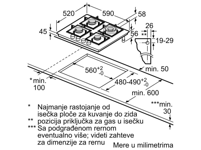 | Dimenzije | Dimenzije aparata: 57.4 x 590 x 520 mm Dimenzije niše: 45 x 560-560 x 480-490 mm |