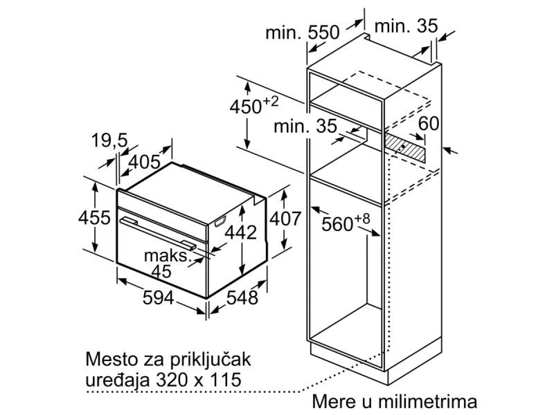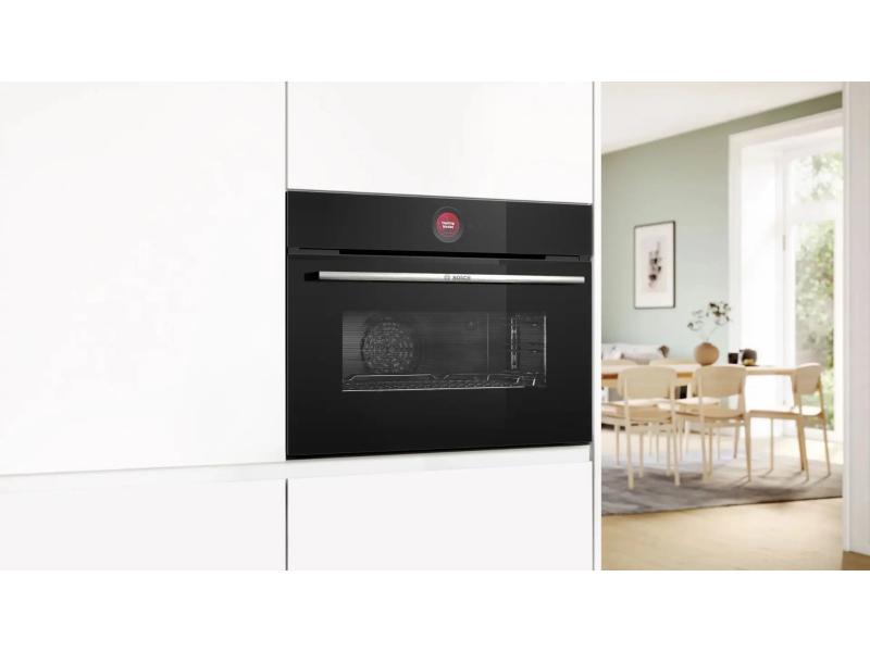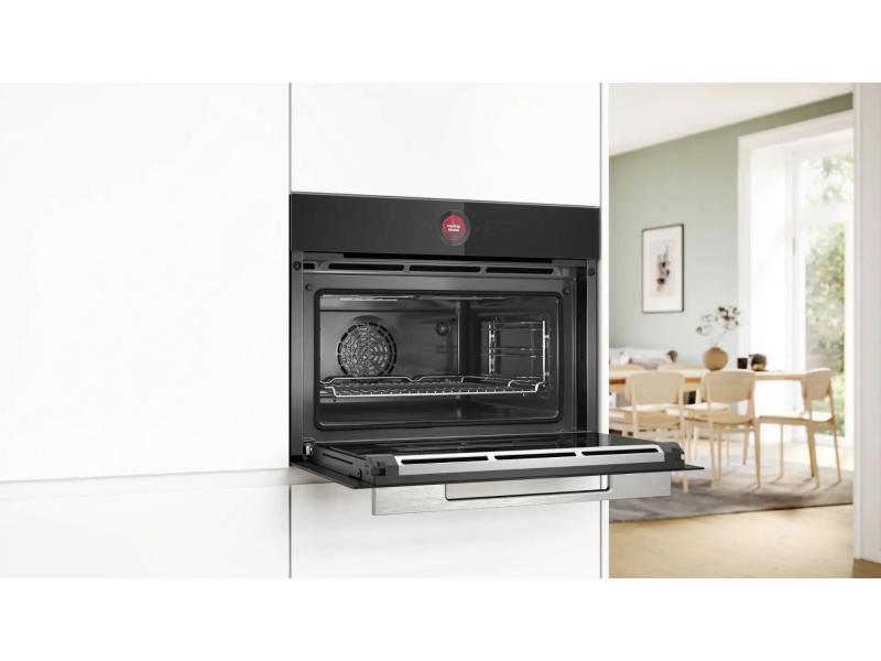 | Ostalo | Karakteristike Zapremina rerne: 47 l Temperaturno područje: 30-300°C Korisnički interfejs: TFT touch display sa digitalnim upravljačkim prstenom Broj režima grejanja i kombinovanja: 12 Ugrađen sistem čišćenja: Piroliza + Hidroliza Priključna snaga: 2900 W Potrošnja energije (konvencionalno): 0.73 kWh/ciklus Potrošnja energije (ventilatorsko): 0.61 kWh/ciklus Pribor: Rešetka, Univerzalna posuda za pečenje Funkcije Funkcija Home Connect: Daljinsko praćenje i upravljanje Oven Assistant funkcija sa glasovnom kontrolom Recipe World funkcija 2D vrući vazduh Načini grejanja Odleđivanje, Vreo vazduh, Gril pune širine, Roštilj pola širine, Konvencionalno zagrevanje, Konvencionalno nežno grejanje, Donje zagrevanje, Gril na vrućem vazduhu, Circulating air gentle, Cirkulišući vazduh, predzagrevanje, zagrevanje |