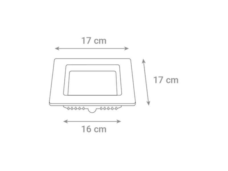 | Karakteristike | Snaga: 12W Boja svetlosti: 6500K IP stepen zaštite: IP44 Napon: AC 85 - 265 V / 50 - 60 Hz Flux: 100 lm / W Ugao svetlosti: 120° UGR: > 19 LED diode: EPISTAR RA: > 80 Tip drivera: izolovan Radni vek: 30.000 radnih sati Sertifikati: CE, FCC, RoHS Dimenzije svetiljke: 170 x 170 x 28 mm Dimenzije instalacionog otvora: 160 x 160 x 25 mm Neto težina: 0,305 kg Bruto težina: 0,400 kg Dimenzije pakovanja: 200 x 195 x 40 mm |