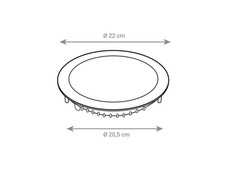 | Karakteristike | Snaga: 18W Boja svetlosti: 6500K IP stepen zaštite: IP44 Napon: AC 85 - 265 V / 50 - 60 Hz Flux: 100 lm / W Ugao svetlosti: 120° UGR: > 19 LED diode: EPISTAR RA: > 80 Tip drivera: izolovan Radni vek: 30.000 radnih sati Sertifikati: CE, FCC, RoHS Dimenzije svetiljke: Ø 220 x 28 mm Dimenzije instalacionog otvora: Ø 205 x 25 mm Neto težina: 0,400 kg Bruto težina: 0,530 kg Dimenzije pakovanja: 255 x 250 x 40 mm |