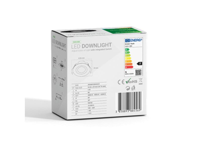 | Karakteristike | Snaga: 5 W Boja svetlosti: 3CCT, 3000K-4000K-6500K IP stepen zaštite: IP20 Napon: AC 100 - 240 V / 50 - 60 Hz Flux: 80 lm / W Ukupan svetlosni tok: 400 lm Ugao svetlosti: 38° Ugao zakretanja svetiljke: 45° CRI: > 80 PF: > 0,5 Radni vek: 15000 radnih sati Sertifikati: CE, RoHS Neto težina: 0,055 kg Bruto težina: 0,075 kg Dimenzije artikla: Ø 85 x 39 mm (Ø 70 mm) Dimenzije pakovanja: 87 x 87 x 48 mm |