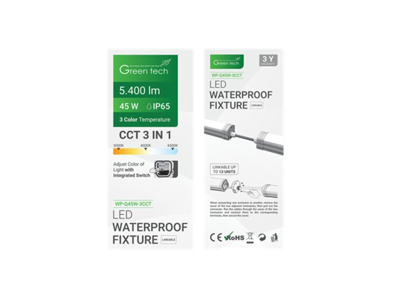 | Karakteristike | Snaga: 45 W Boja svetlosti: 3000 K - 4000 K - 6500 K Odabir boje svetlosti pomoću integrisanog prekidača IP stepen zaštite: IP65 Napon: AC 160 - 240 V / 50 - 60 Hz P.F.: > 0,5 Flux: 120 lm / W Ukupan tok svetlosti: 5400 lm Ugao svetlosti: 150° Indeks prikaza boja (CRI): > 80 LED diode: SMD 2835 Radna temperatura: od - 20°C do 45°C Vek trajanja: 30 000 radnih sati Materijal: PC Neto težina: 0,988 kg Bruto težina: 1,019 kg Dimenzije artikla: 1550 x 61 x 56 mm Dimenzije pakovanja: 1610 x 70 x 60 mm Sertifikati: CE, RoHS Svetiljka je linkabilna i podržava povezivanje do 13 svetiljki u nizu |
