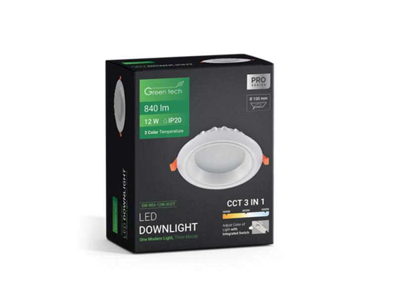 | Karakteristike | Snaga: 12 W Boja svetlosti: 3CCT - 3000 K - 4000 K - 6500 K Odabir boje svetlosti pomoću ugrađenog prekidača LED diode: SMD 2835 Svetlosna efikasnost: 70 lm / W Flux: 840 lm Napon: AC 85 - 265 V / 50 - 60 Hz CRI: 80 PF: ≥ 0,5 SCDM: ≤ 15 Ugao svetlosti: 120° IP stepen zaštite: IP20 Materijal: Aluminijum + PS Radni vek: 30 000 radnih sati Neto težina: 0,022 kg Bruto težina: 0,032 kg Dimenzije artikla: Ø 120 x 50 mm Dimenzije dela za ugradnju: Ø 100 mm Dimenzije pakovanja: 145 x 60 x 165 mm Sertifikati: CE, RoHS |