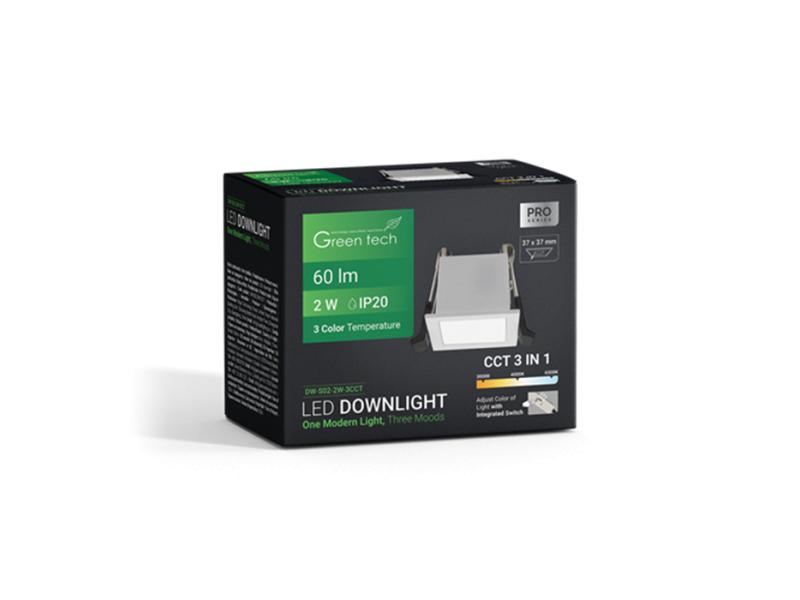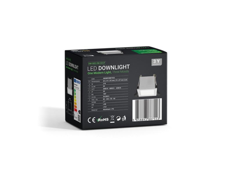 | Karakteristike | Snaga: 2 W Boja svetlosti: 3CCT - 3000 K - 4000 K - 6500 K Odabir boje svetlosti pomoću ugrađenog prekidača LED diode: SMD 3030 Svetlosna efikasnost: 30 lm / W Flux: 60 lm Napon: AC 85 - 265 V / 50 - 60 Hz CRI: ≥ 80 PF: ≥ 0,5 SCDM: ≤ 7 Ugao svetlosti: 100° IP stepen zaštite: IP20 Materijal: Aluminijum + PS Radni vek: 30 000 radnih sati Neto težina: 0,070 kg Bruto težina: 0,084 kg Dimenzije artikla: 42 x 41 x 32 mm Dimenzije dela za ugradnju: 37 x 37 mm Dimenzije pakovanja: 70 x 60 x 85 mm Sertifikati: CE, RoHS |