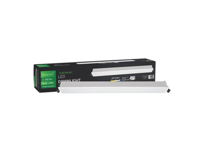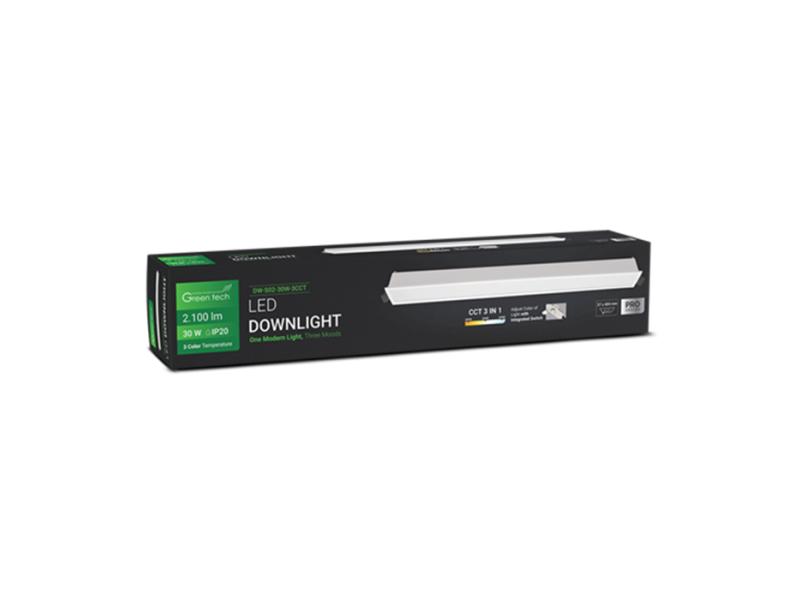 | Karakteristike | Snaga: 30 W Boja svetlosti: 3CCT - 3000 K - 4000 K - 6500 K Odabir boje svetlosti pomoću ugrađenog prekidača LED diode: SMD 3030 Svetlosna efikasnost: 70 lm / W Flux: 2100 lm Napon: AC 85 - 265 V / 50 - 60 Hz CRI: ≥ 80 PF: ≥ 0,5 SCDM: ≤ 7 Ugao svetlosti: 100° IP stepen zaštite: IP20 Materijal: Aluminijum + PS Radni vek: 30 000 radnih sati Neto težina: 0,380 kg Bruto težina: 0,420 kg Dimenzije artikla: 409 x 41 x 32 mm Dimenzije dela za ugradnju: 37 x 404 mm Dimenzije pakovanja: 70 x 55 x 435 mm Sertifikati: CE, RoHS |