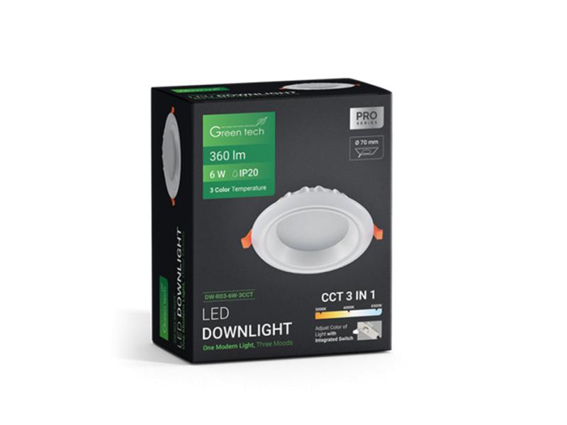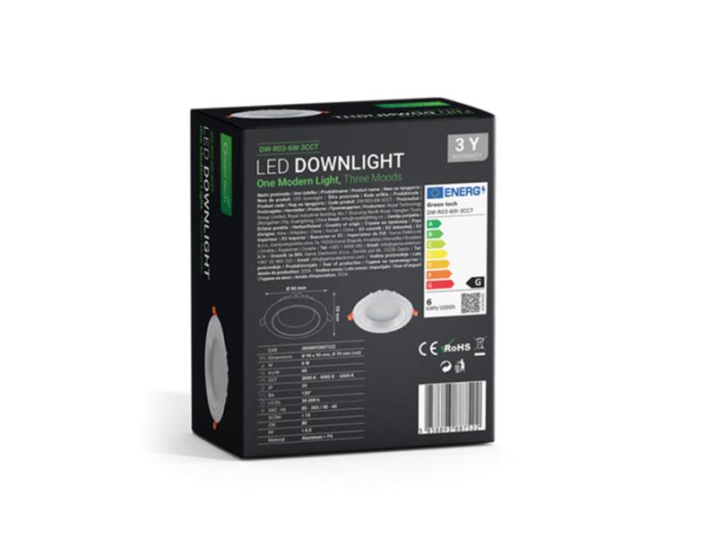 | Karakteristike | Snaga: 6 W Boja svetlosti: 3CCT - 3000 K - 4000 K - 6500 K Odabir boje svetlosti pomoću ugrađenog prekidača LED diode: SMD 2835 Svetlosna efikasnost: 60 lm / W Flux: 360 lm Napon: AC 85 - 265 V / 50 - 60 Hz CRI: 80 PF: ≥ 0,5 SCDM: ≤ 15 Ugao svetlosti: 120° IP stepen zaštite: IP20 Materijal: Aluminijum + PS Radni vek: 30 000 radnih sati Neto težina: 0,075 kg Bruto težina: 0,1075 kg Dimenzije artikla: Ø 90 x 50 mm Dimenzije dela za ugradnju: Ø 70 mm Dimenzije pakovanja: 115 x 55 x 140 mm Sertifikati: CE, RoHS |